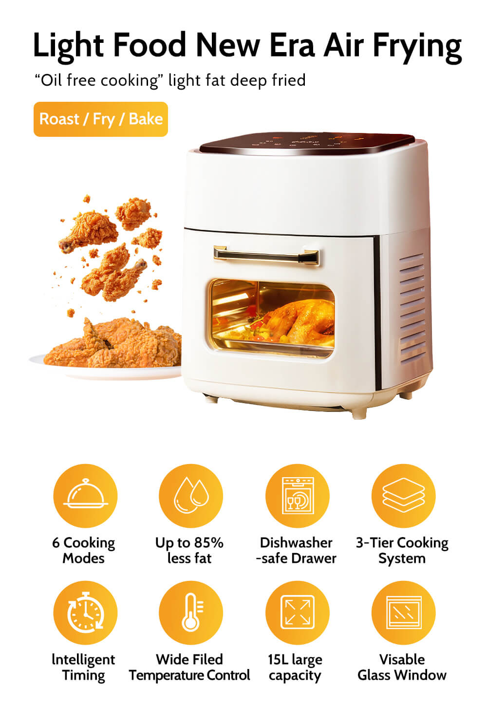 Enjoy healthier meals and faster cooking with this 15L multifunction air fryer oven, designed for families seeking convenience and performance. With 1400W high-efficiency heating and 360° rapid air circulation, it cooks meals evenly with up to 85% less oil.