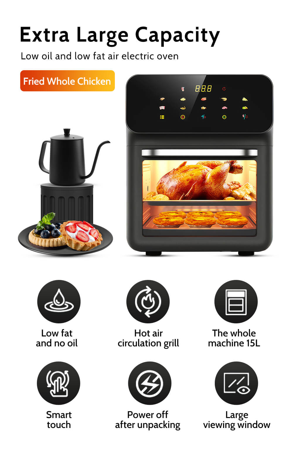 Powered by 1850W and 360° hot air circulation, it reduces oil use while cooking up to 30% faster than traditional ovens. The intuitive LED touch panel ensures easy control, and cleanup is a breeze with dishwasher-safe accessories and a fully removable door for interior access.